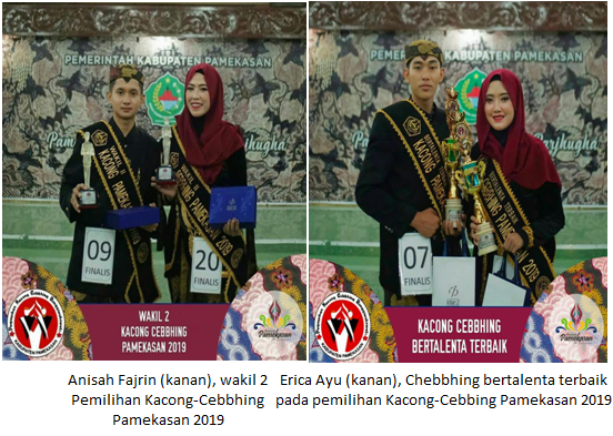 Pemerintah kabupaten Pamekasan melalui Dinas Pariwisata dan Kebudayaan menggelar grand final pemilihan Kacong-Cebbhing Pamekasan 2019 di halaman pendopo Ronggosukowati, pada hari Sabtu, tanggal 3 Agustus 2019, pukul 19.00 WIB. Malam grand final dibuka oleh Sekdakab Pamekasan H. Totok Hartono. Dari sepuluh peserta Kacong-Cebbhing 2019 yang masuk dalam grand final, siswa SMAN 1 Pamekasan, atas nama Anisah Fajrin terpilih sebagai wakil 2 di pemilihan Kacong-Cebbhing Pamekasan 2019.