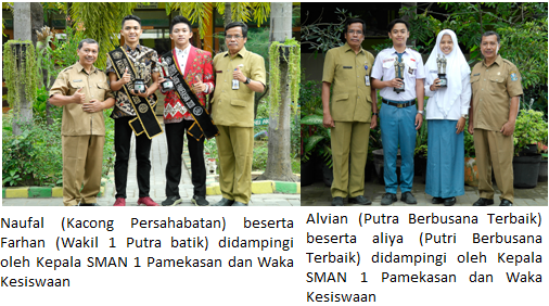 Demikian juga pada ajang Putra-Putri Batik dan Kacong-Cebbing Pamekasan Tahun 2020, peserta didik SMAN 1 Pamekasan juga berhasil mendapat penghargaan. Grandfinal Putra-Putri batik Pamekasan dilaksanakan pada tanggal 9 Oktober 2020, sedangkan grandfinal Kacong-Cebbing Pamekasan dilaksanakan pada tanggal 10 Oktober 2020. Pada ajang Kacong-Cebbing Pamekasan Tahun 2020, Naufal Alif Mudzakir dinobatkan sebagai Kacong Persahabatan Tahun 2020. Sedangkan pada ajang Putra-Putri Batik Pamekasan Tahun 2020, tiga peserta didik SMAN 1 Pamekasan berhasil meraih kejuaraan, masing-masing atas nama Mohammad Farhan, yang dinobatkan sebagai Wakil 1 Putra Batik Tahun 2020, Moh. Alvian Evendi, yang dinobatkan sebagai Putra Batik Berbusana Terbaik Tahun 2020, dan Aliya Shabira Kusriyandini, yang dinobatkan sebagai Putri Batik Berbusana Terbaik Tahun 2020.